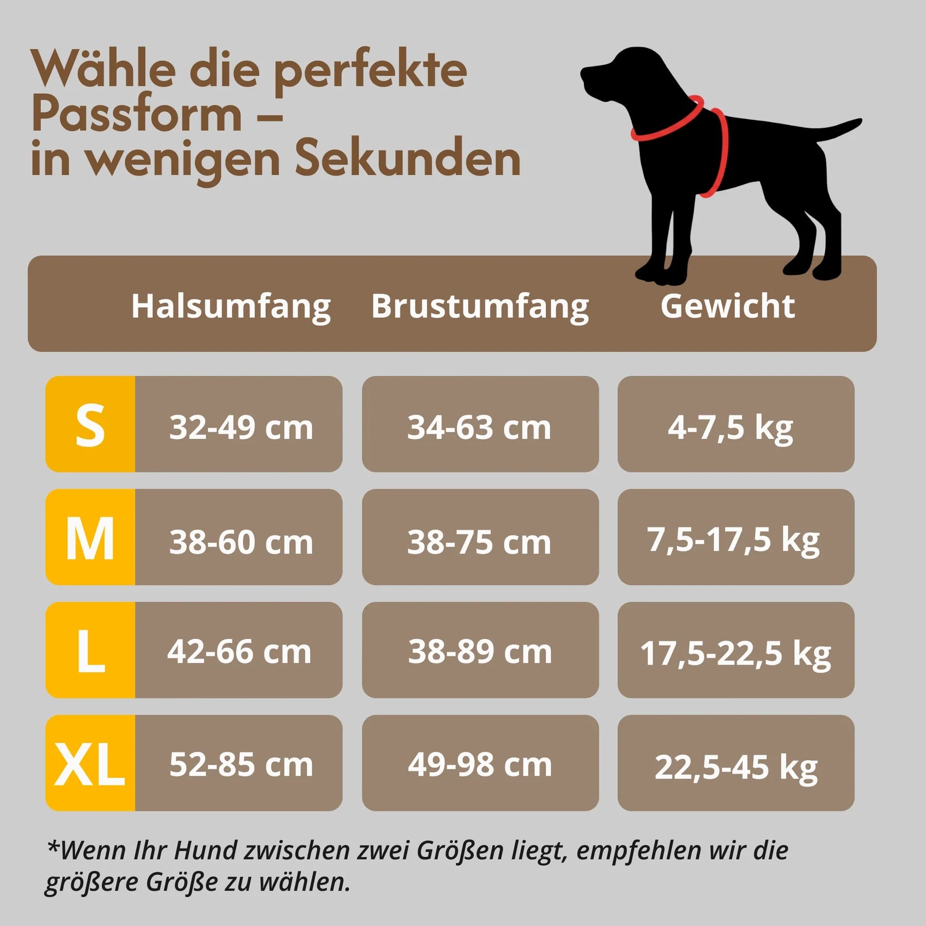 Nur ein perfekt sitzendes Geschirr schützt die Wirbelsäule deines Hundes. Mit unserer Tabelle findest du in Sekunden die richtige Größe für ein schmerzfreies Laufen.